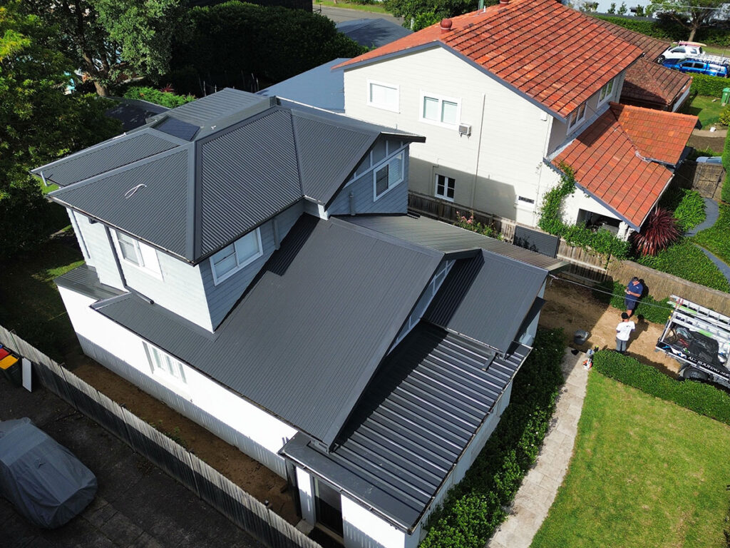 - Lower Roof: Multiple planes and steps requiring custom Colorbond flashings, careful installation to preserve existing timber cladding